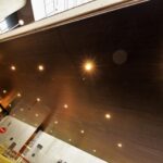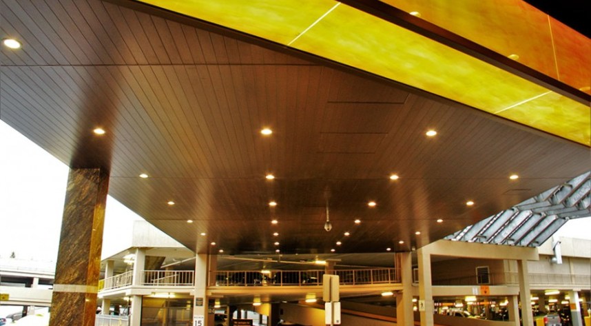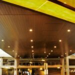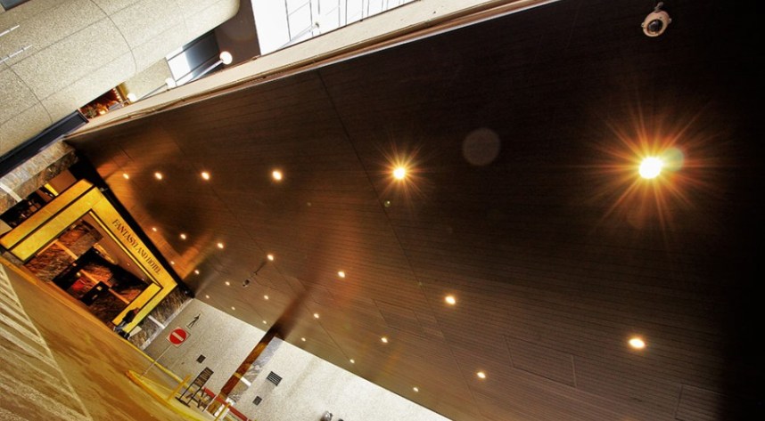In this application an exterior specific environmental t-bar grid system was suspended and anchored to the concrete structured ped-way, connecting the hotels lobby to the mall parkade. SAGIREV REF # 4 Espresso Blackwood 6″ panels were then fastened to the face of the grid and finished with J mold along the perimeter and an H mold along four continuous seams.
