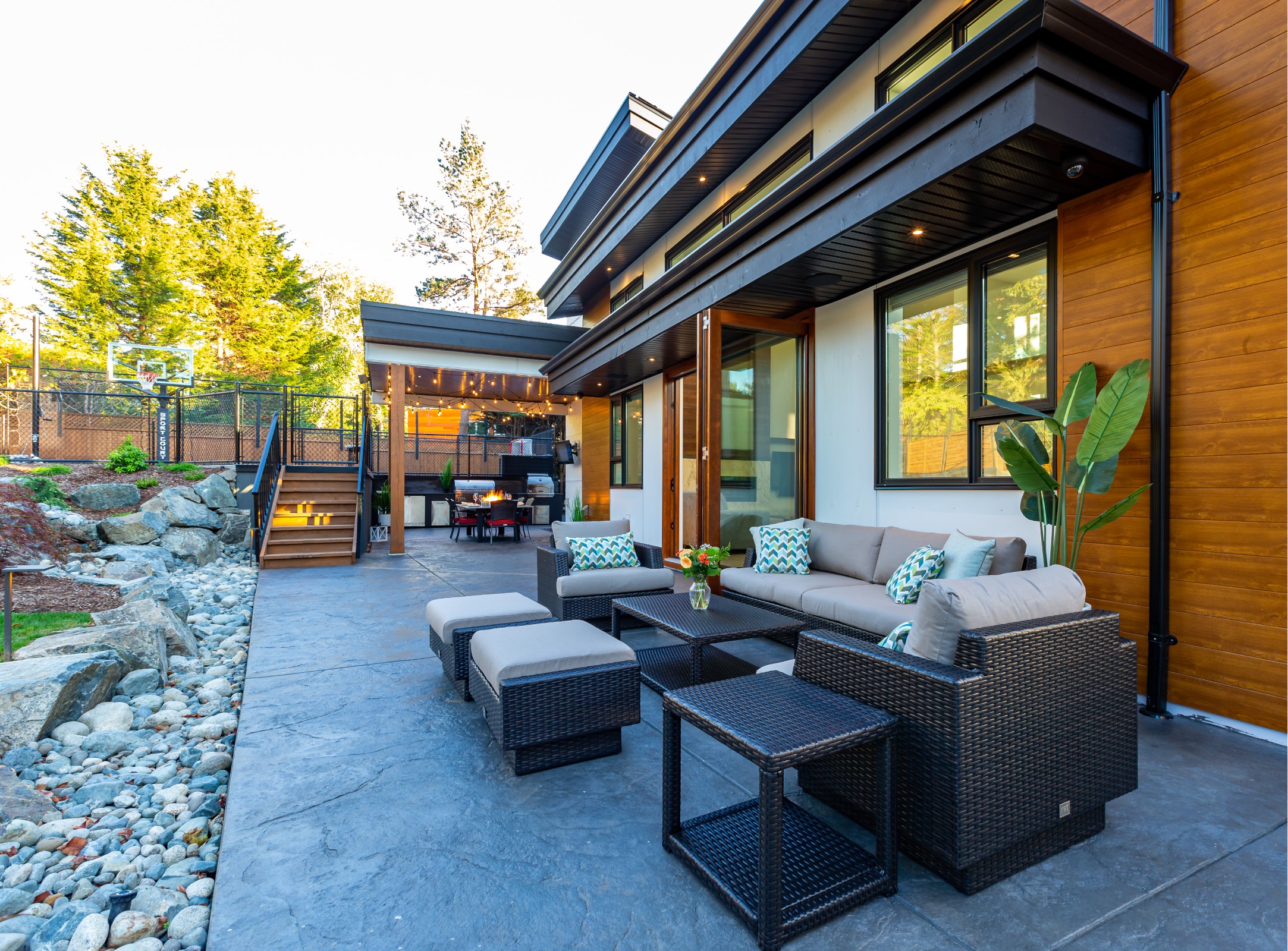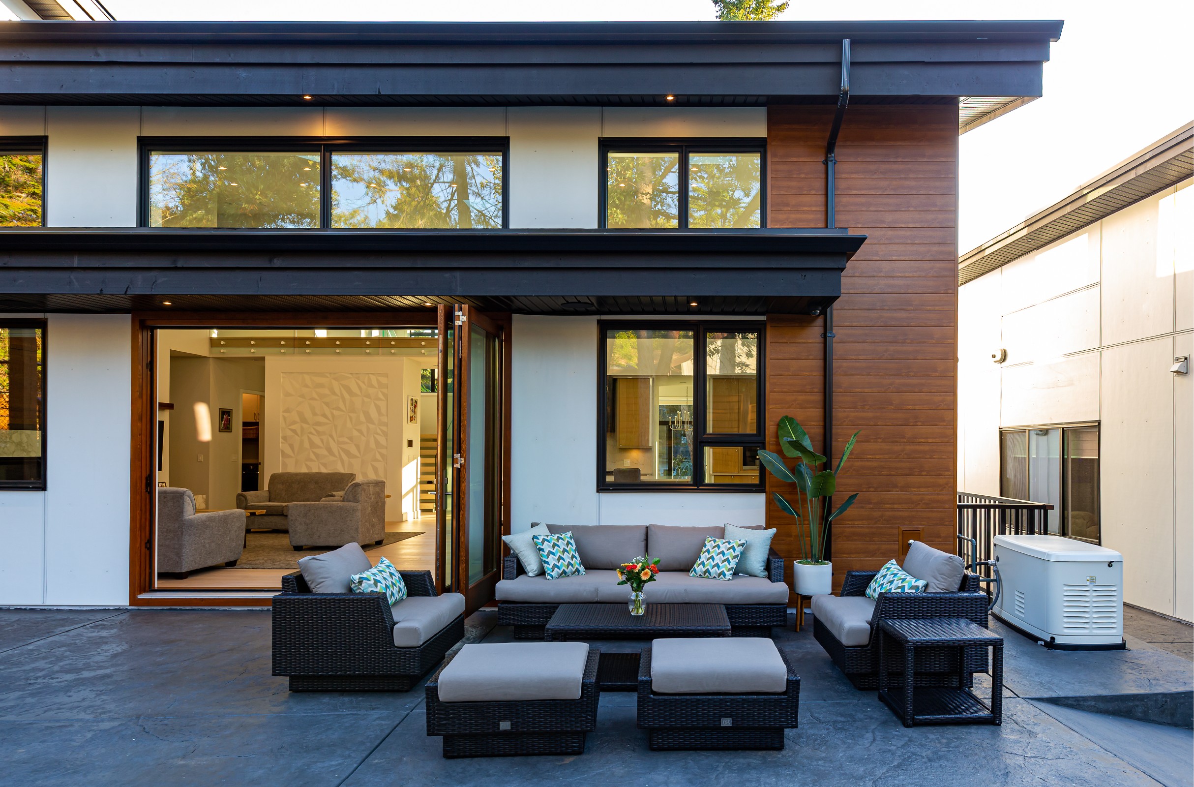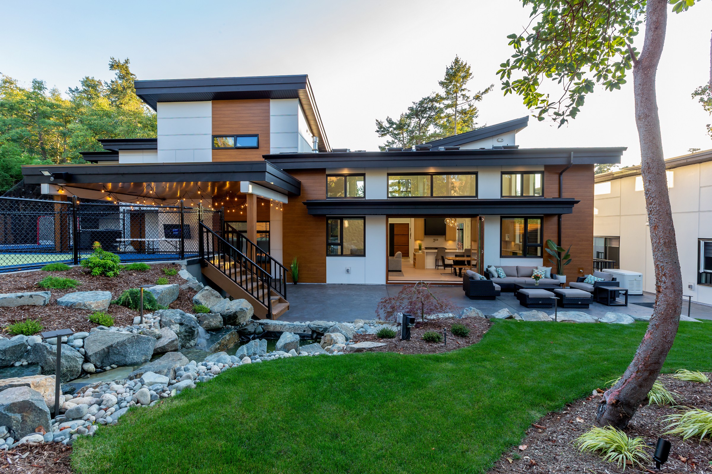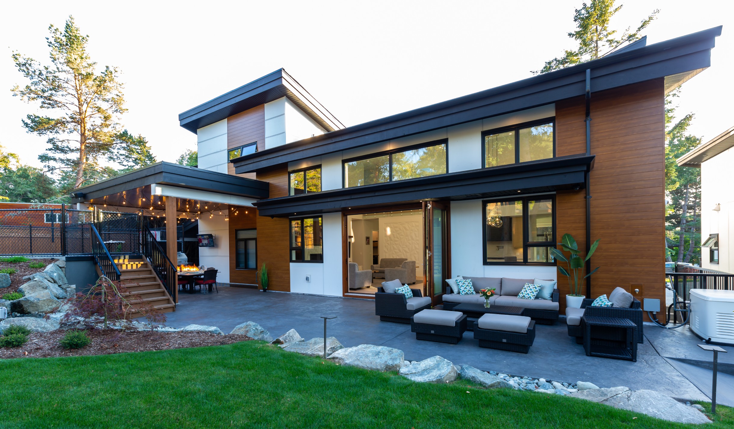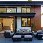 This beautiful custom home located on the west coast screams curb appeal! The use of large white siding panels mixed with our 6″ Sagiwall cladding in a horizontal application makes this home stand out from the road. In the back covered deck area the client utilized our Sagirev 6″ panels on the ceiling to give the outdoor eating space a modern touch.