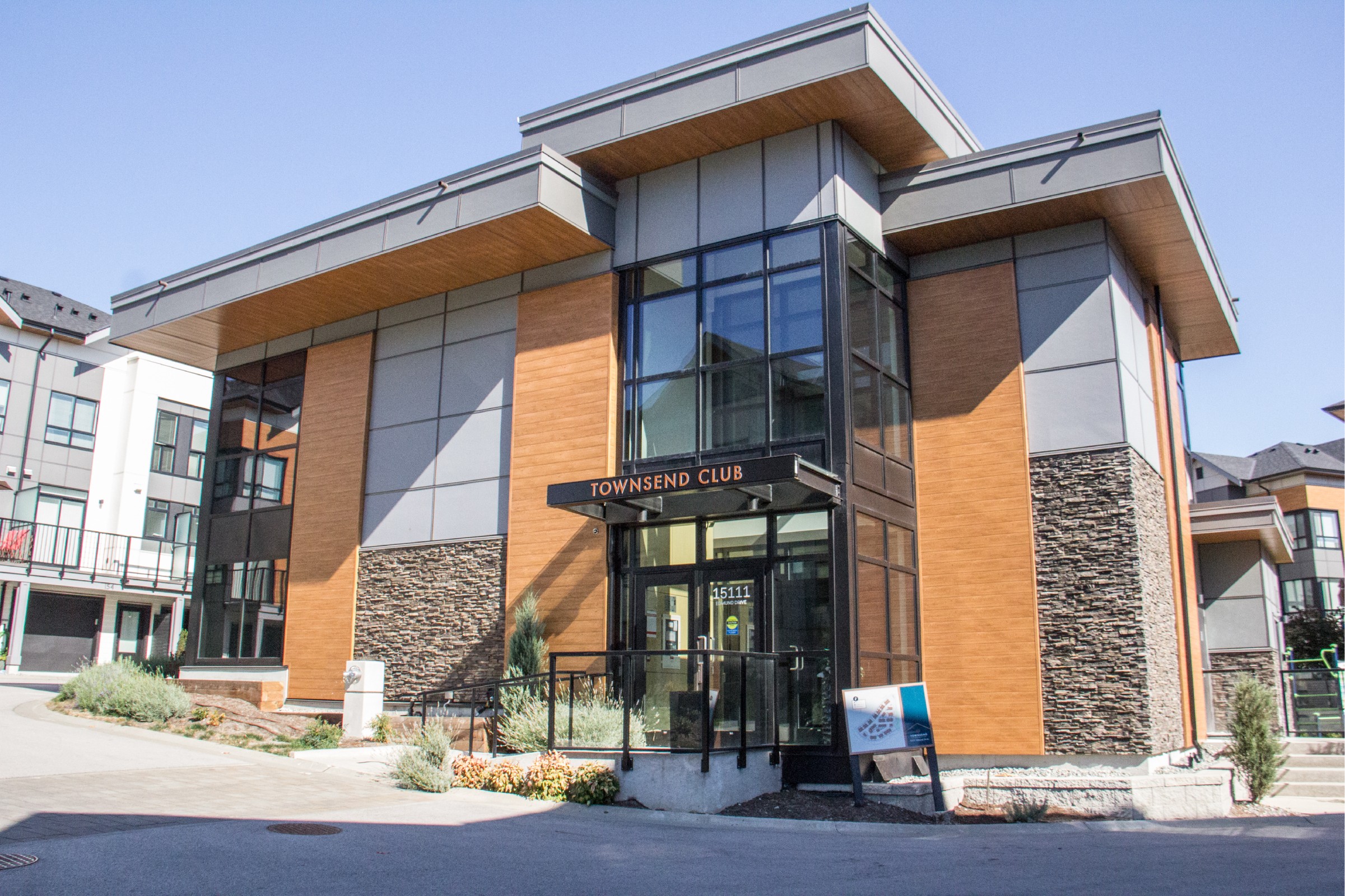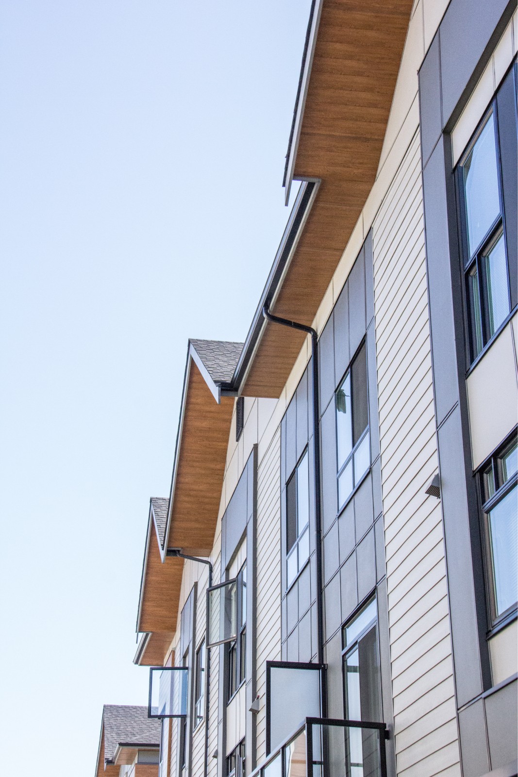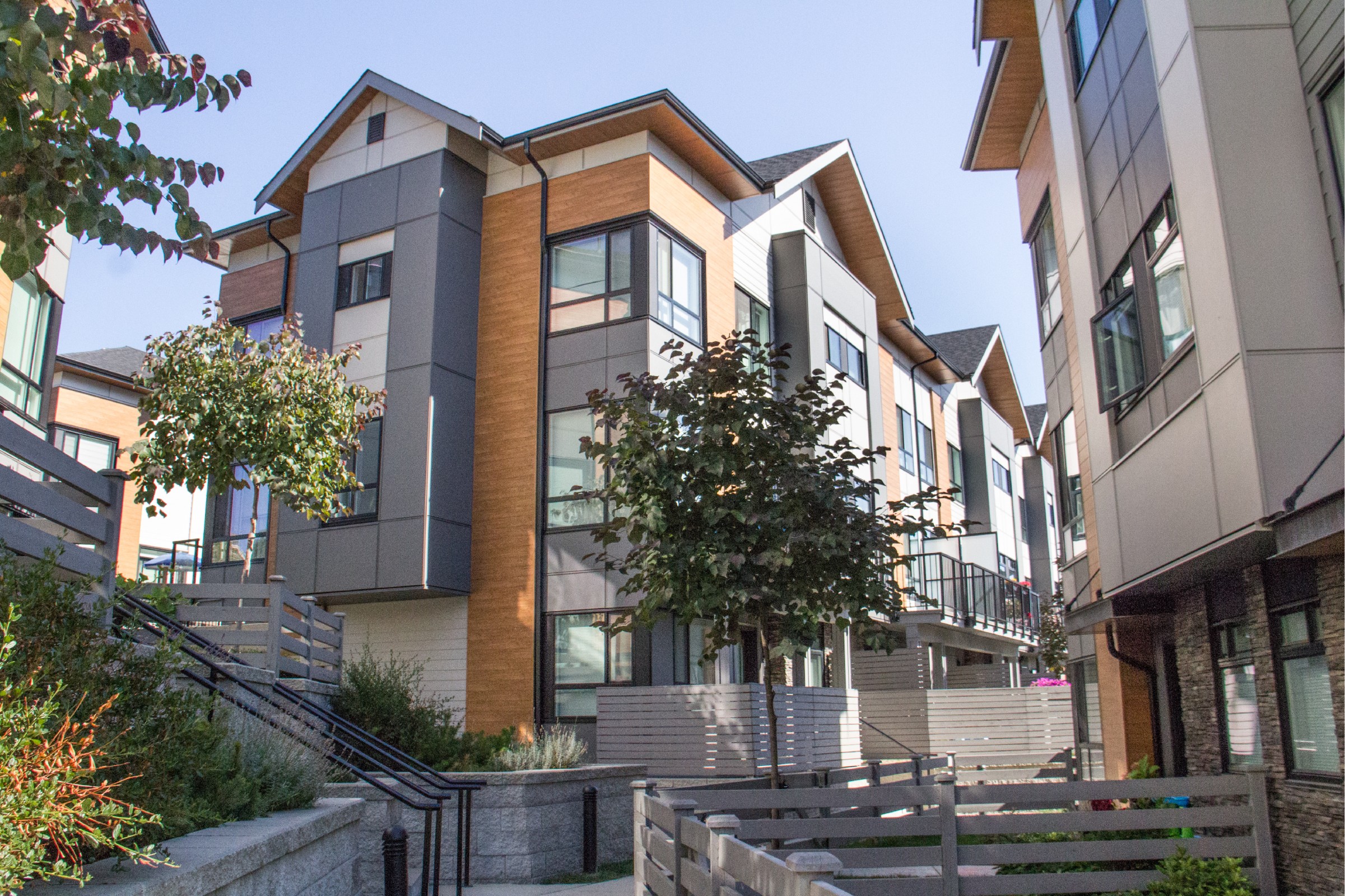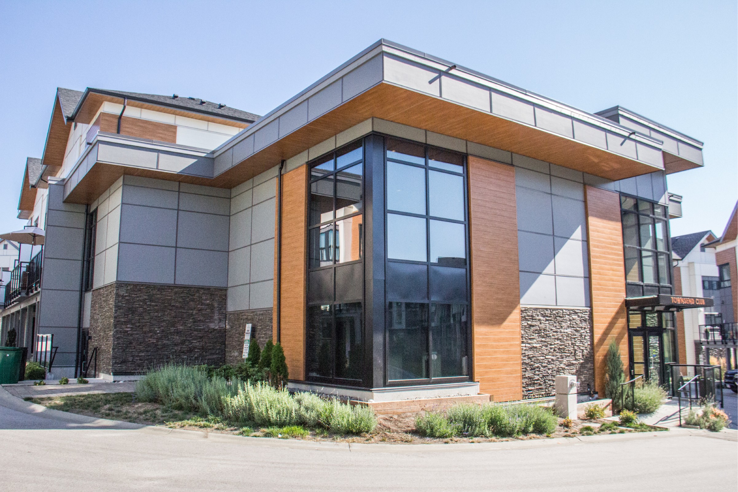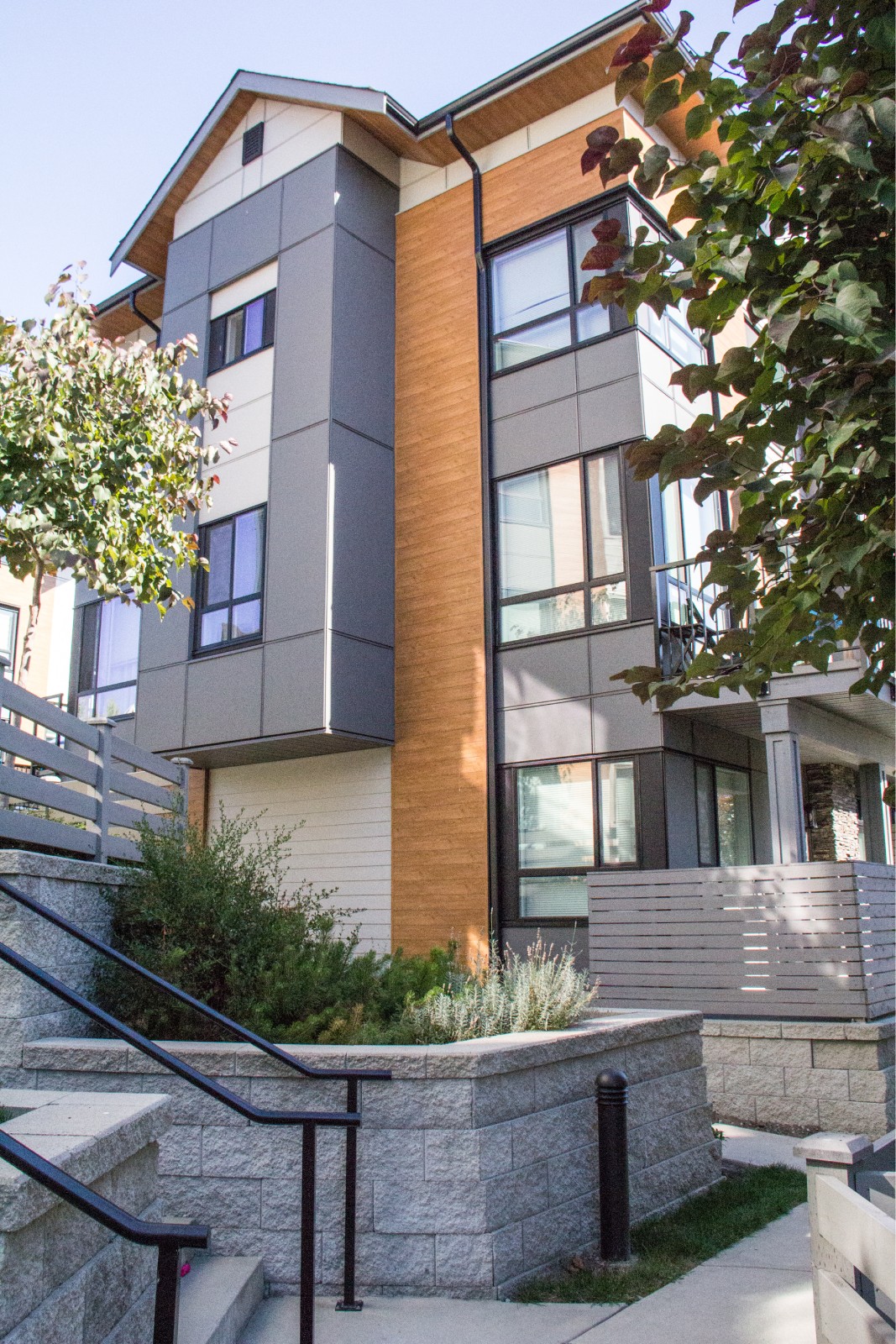 We are proud to be the wood accent feature product of choice used on this development to help achieve this contemporary look. Our Sagiwall Cladding and Sagirev Soffit in Ref 79 Knotty Maple truly makes the exterior pop!