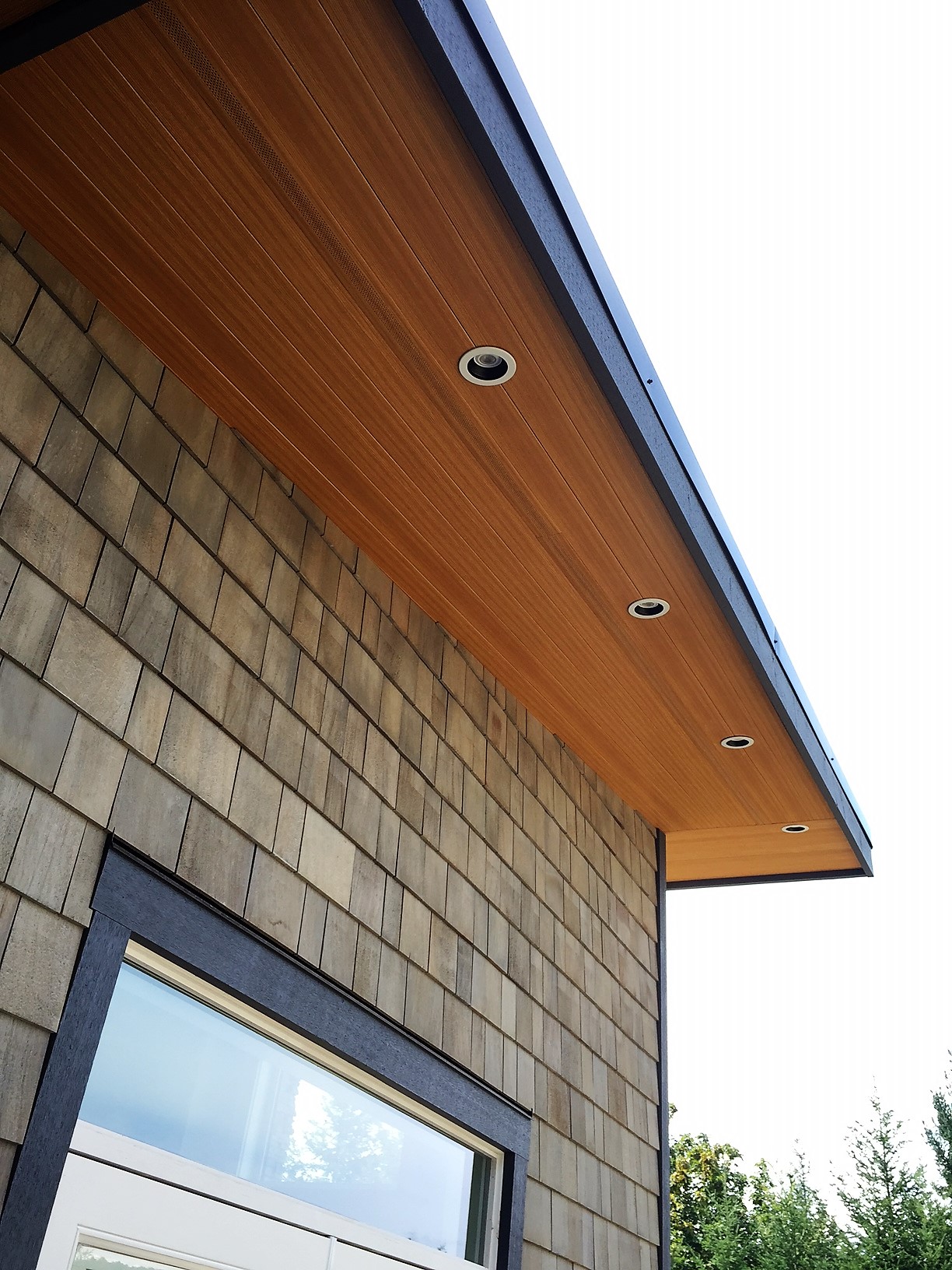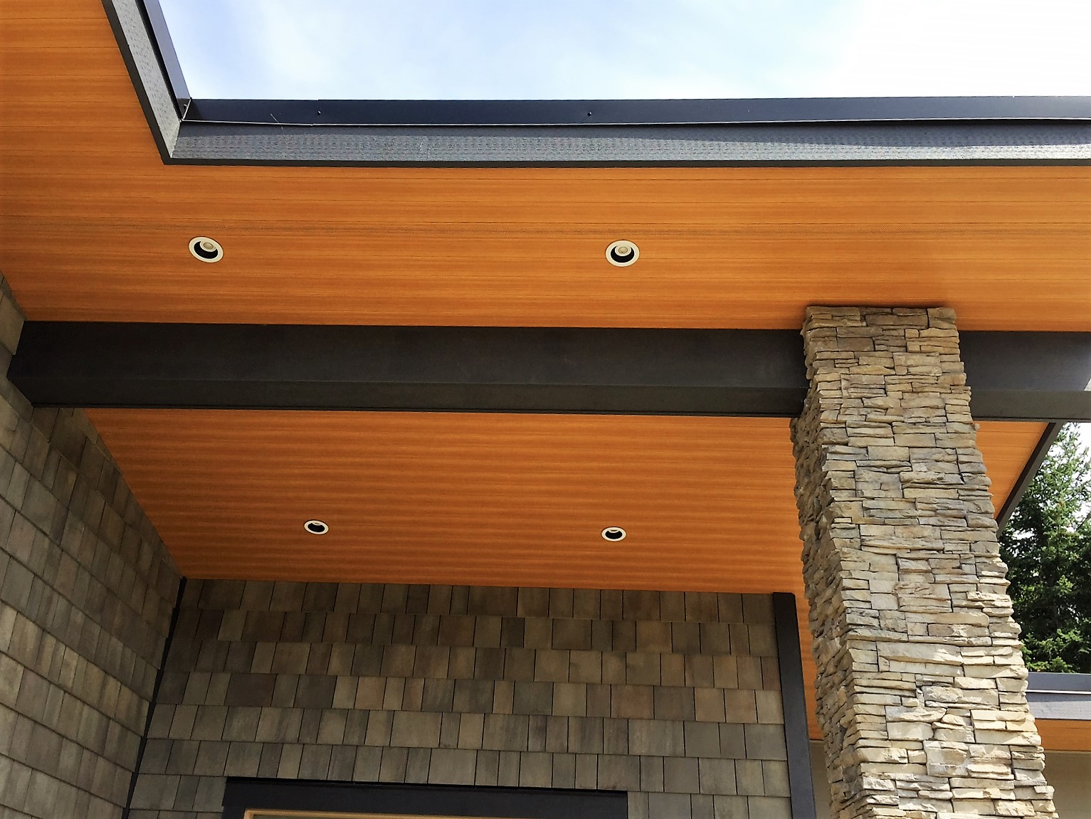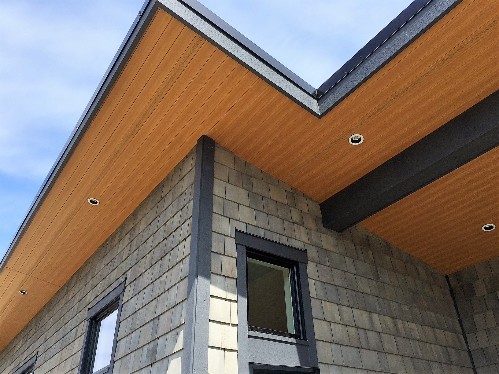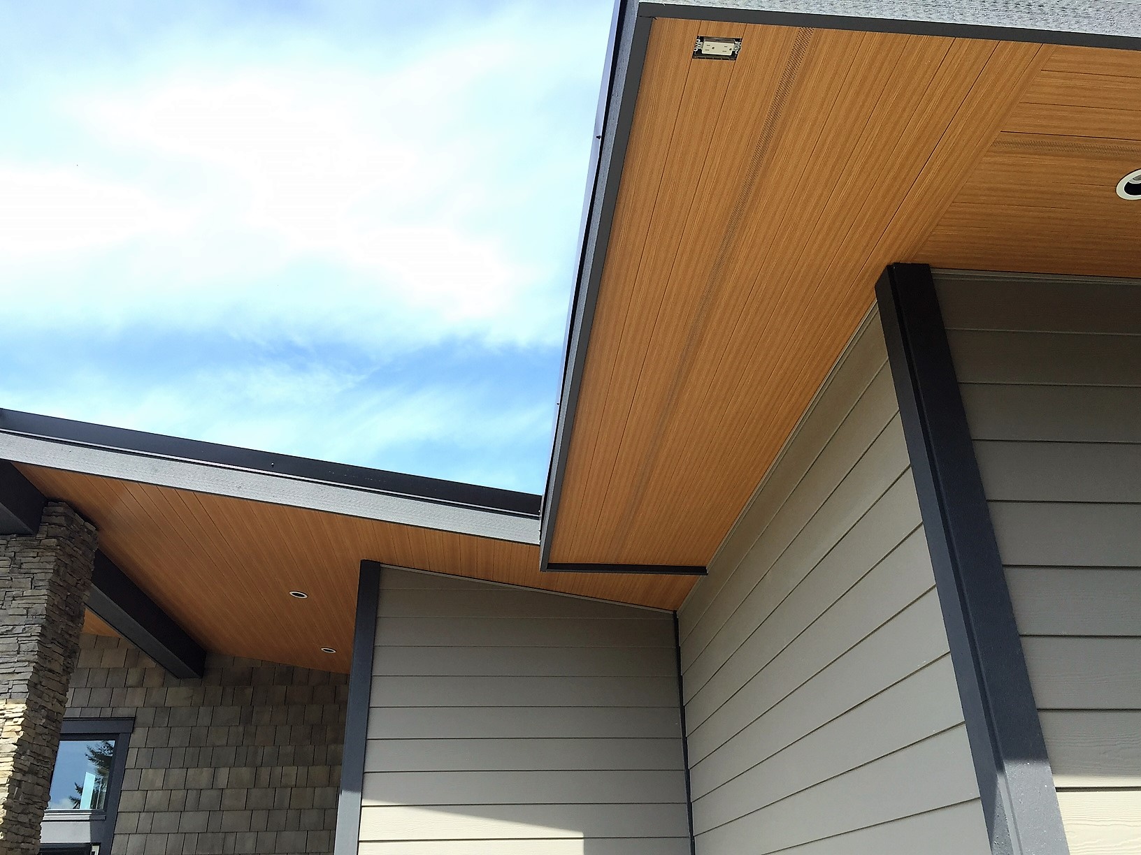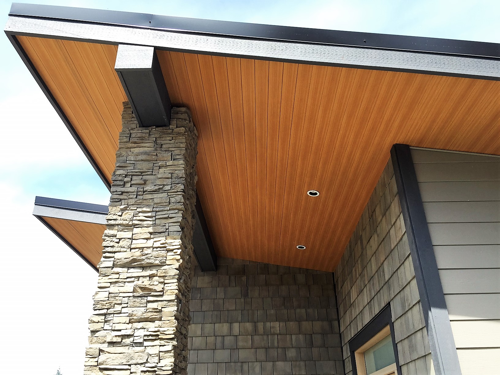 This beautiful Vancouver Island Cottage used our 4″ SAGIREV panels in the Ref# 9 Caramel Zebrawood finish. The panels were installed adjacent to the home while using our color matched vent strip for ventilation.