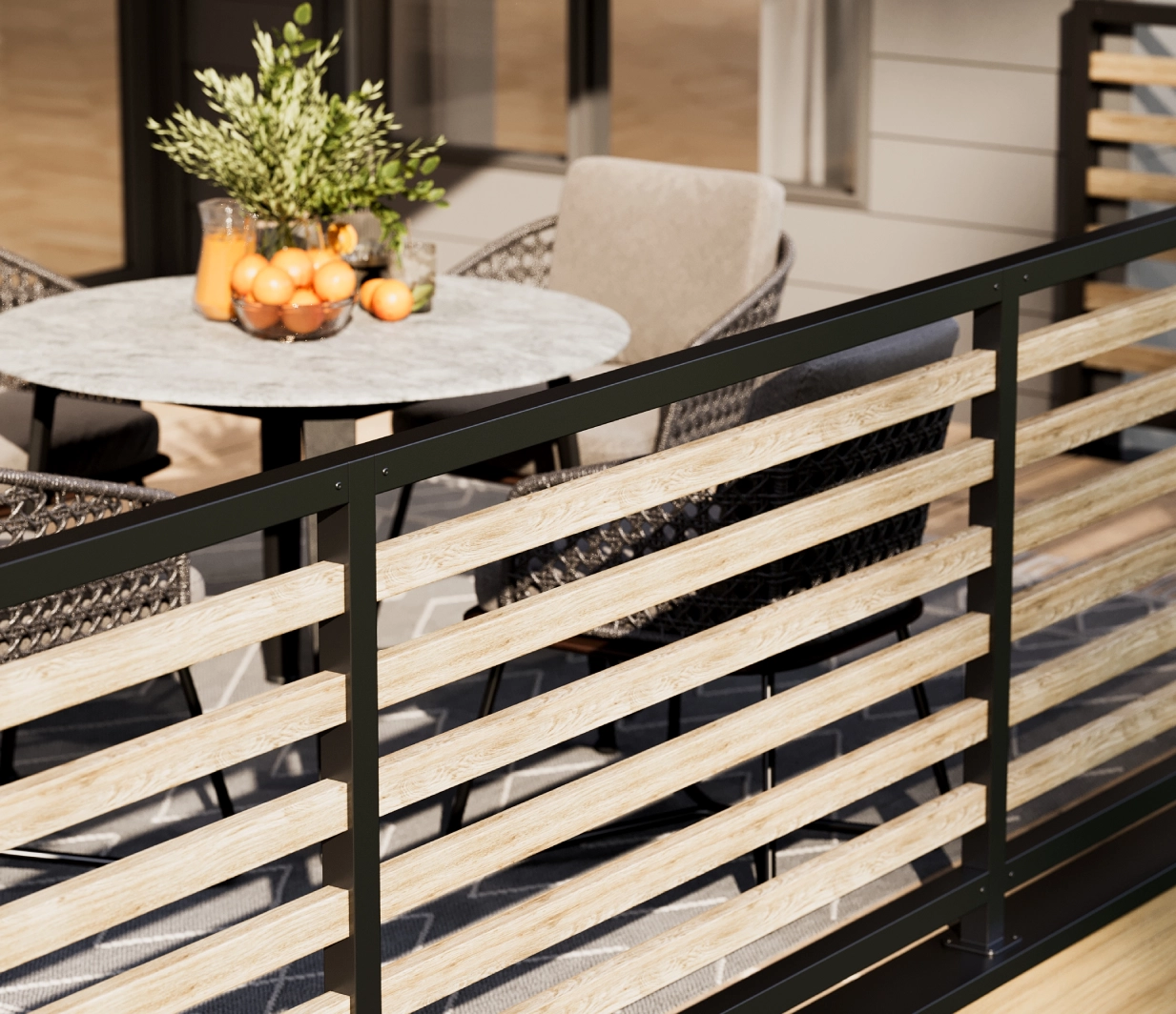 SAGISCREEN is available in both horizontal and vertical woodgrain picket configurations, allowing designers to control rhythm, privacy, and visual emphasis. A matching 6 inch flat top drink rail is also available, delivering a refined finish that integrates seamlessly with the woodgrain aesthetic.