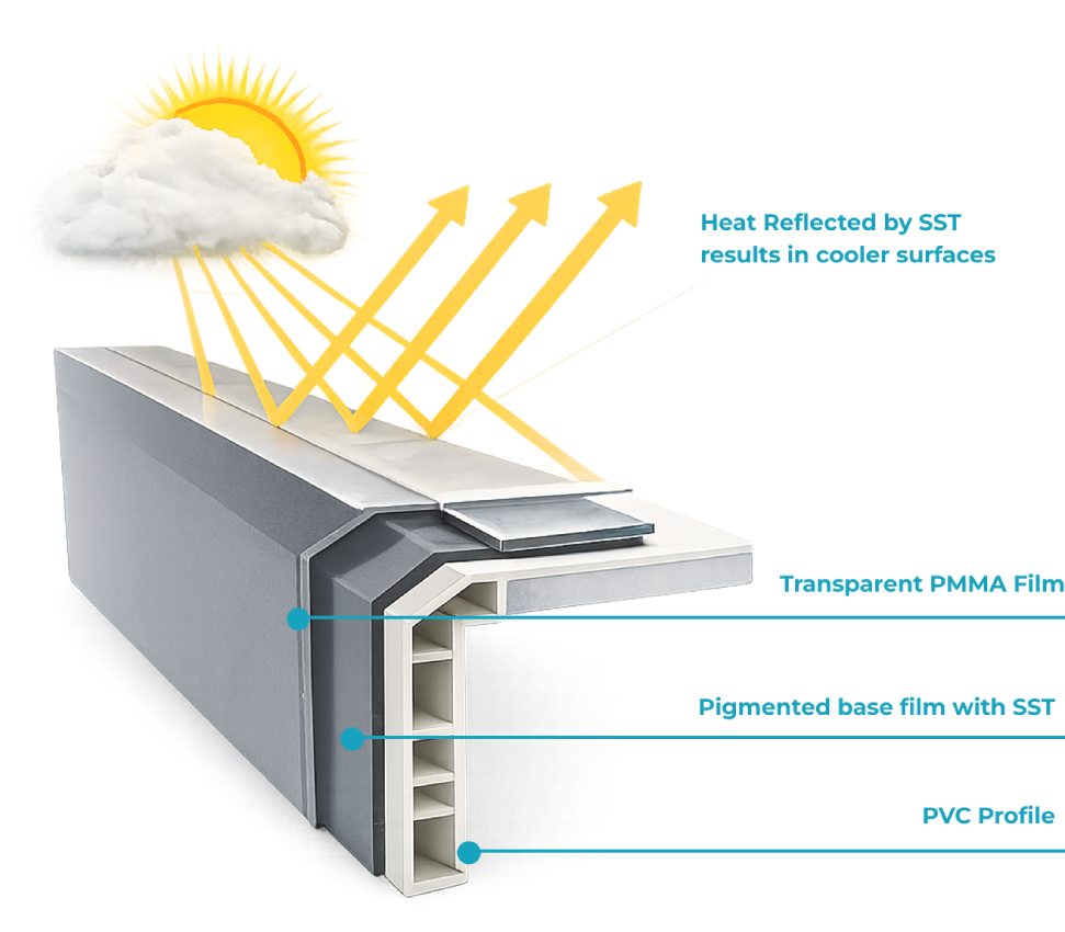 Solar Shield Technology (SST) reflects heat from the sun before it enters the surface. This helps reduce heat build-up and keeps profiles more stable over time, especially in darker colours.
